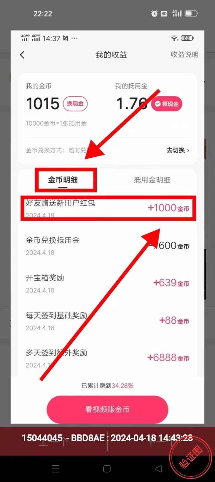 3.金币明细要求:必须有“新人大礼包”和“好友赠送新用户红包”。刷2分钟视频,才会有新人大礼包。