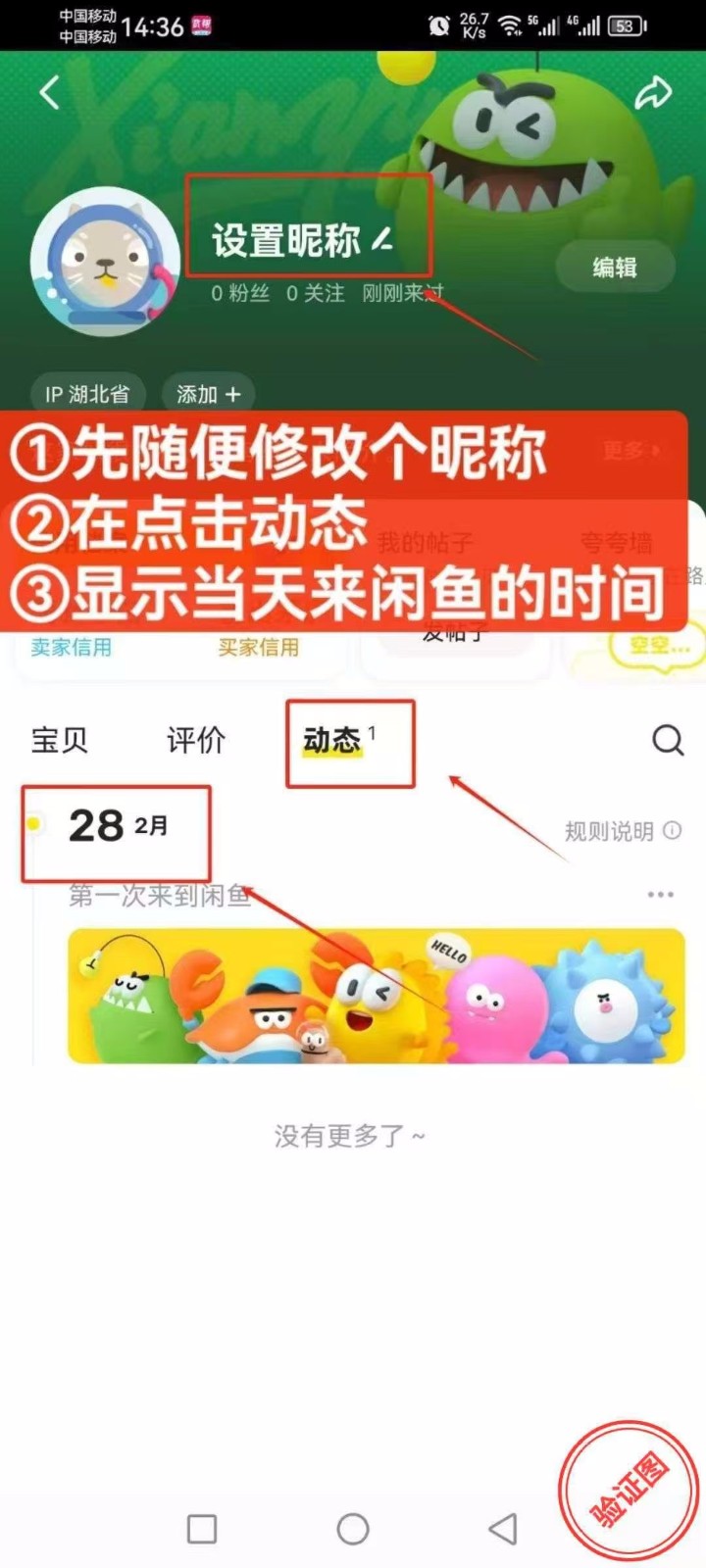 登入软件,点击我的-我的头像-点击动态第一次来闲鱼日期截图 【显示第一次来到闲鱼日期不是今天的,就是老用户,老用户禁止提交,请放弃任务,恶意提交举报)